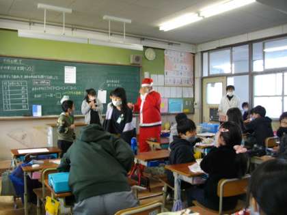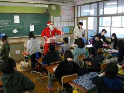給食時間にサンタさんがやってきて,チョコレートケーキをプレゼントしてくれました。