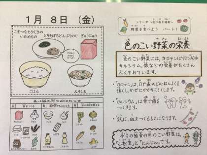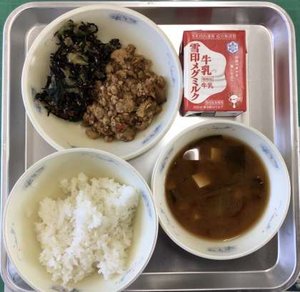 「こまつなとひじきのいためもの・ぎゅうにゅう・ごはん・みそしる」です。