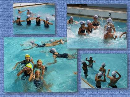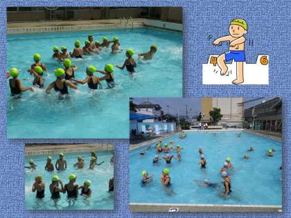 やはり,この暑さです。水に入るのが一番。まずはプールへ。いつもの授業で入るプールとはやはり違いますね。でも,安全には十分気をつけて!