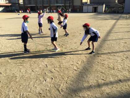 音がくの 学しゅうでは,『大なみ 小なみ』のうたをしって,じっさいに そとで なわとびで チャレンジしました。