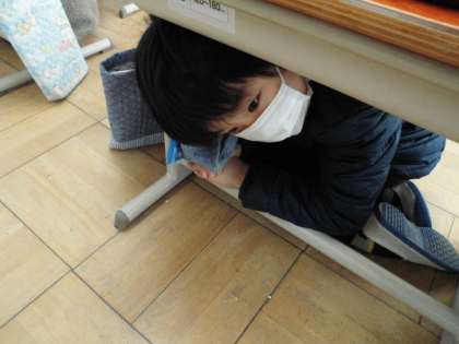 1月17日は,阪神淡路大震災の起きた日でした。いつ,どんなところで じしんがきても 大じょうぶなように,きょうしつで ゆれているときには どうすればいいのかれんしゅうをしました。