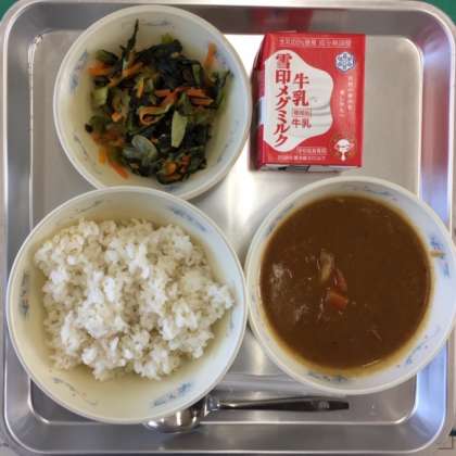 本日の献立は「こまつなのソテー・ぎゅうにゅう・むぎごはん・チキンカレー」です。