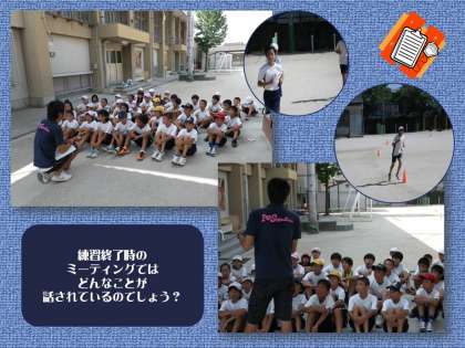 練習終了後にミーティングをする陸上部の子どもたち。渡り廊下を一瞬吹き抜けた風を感じた子どもたちが「わぁ!涼しいなぁ。」と思わず言いました。