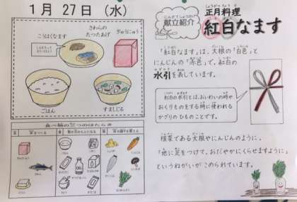 本日の献立は「紅白なます・さわらのたつたあげ・牛乳・ごはん・すましじる」です。