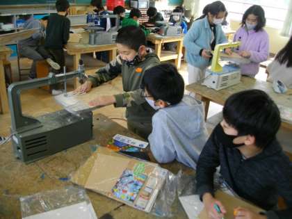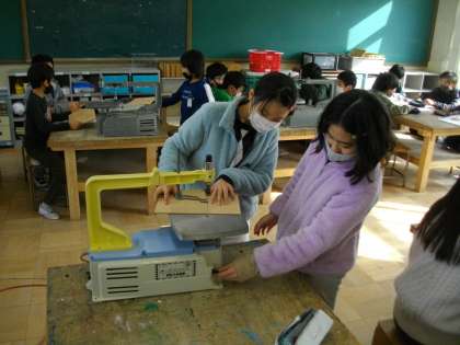 図工で「でこぼこの絵」を学習しています。電動のこぎりを使っています。