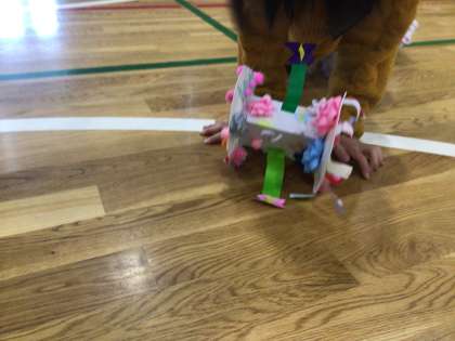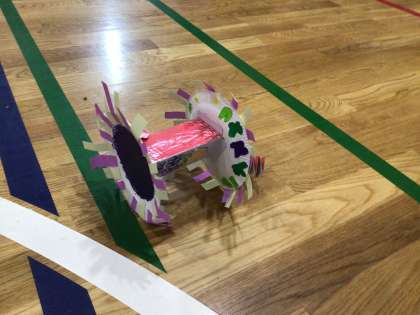 ずこうの 学しゅうでつかった「かみざらコロコロ」を たいいくかんで ころがしてみました。