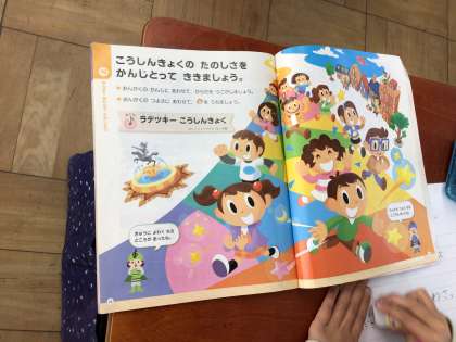 きょくにあわせて てびょうしをしたり こうしんしたりして,リズムよくたのしみました。