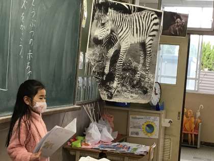 こくごの学しゅうでは,いろいろな どうぶつから えらんだ 赤ちゃんについて しらべて,みんなに クイズを出しました。