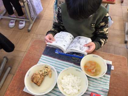 給食の様子です。待っているときは,静かに読書をしたり,話さないように気をつけています。またみんなで楽しく話せるようになるといいですね。