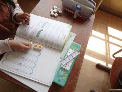 わり算の学習をしました。数図ブロックを使ってわり算の意味を考えたり,答えを出すにはどうしたらいいかを考えたりしています。