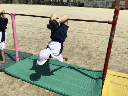 たいいくの学しゅうでは,てつぼうあそびを はじめました。