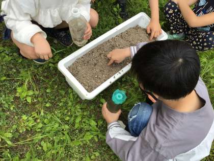 生かつの学しゅうでは,「ぐんぐんそだて じぶんの やさい」で 先しゅう ひりょうをまいた土に えだまめ・いんげん・オクラから 一つをえらんで たねをまきました。