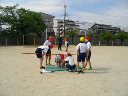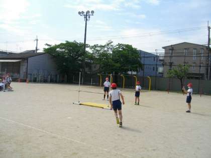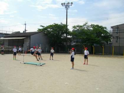 晴天の下,元気に運動をしていました。iPadでフォームや跳躍を撮影してグループでチェックしていました。