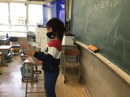 きょうしつに あるものの メモをとって,それを文にして クイズを作って,みんなにはっぴょうしました。