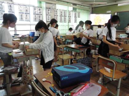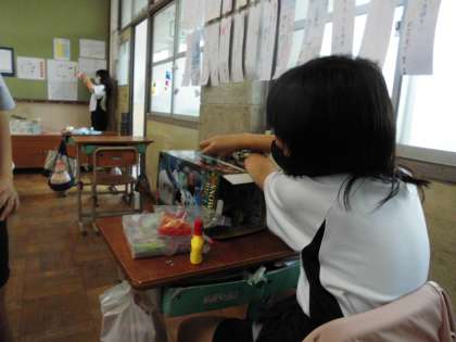 図画工作の時間では,箱の中をのぞいてみると不思議な世界が広がるように考えて工作をしています。水族館のような世界,学校の授業の様子,動物が遊んでいる世界など,想像を膨らませながら取り組んでいます。どんな世界ができるのか楽しみですね。