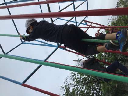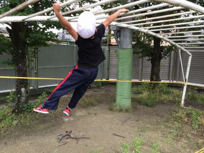 校ていの そうごうゆうぐと うんていに ちょうせんしました。