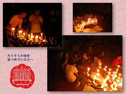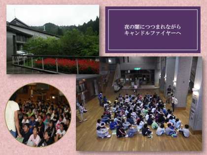 オリエンテーションホールに集まった子どもたちは,まず,このキャンドルファイヤーに対して,心をそろえて,厳粛な気持ちで臨むことを確かめあいました。