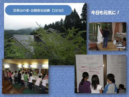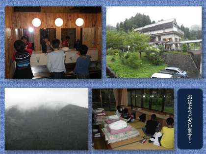 台風が最接近中の京都市。その北の山間部にある「花背山の家」で,子どもたちは最初の朝を迎えました。風や雨の音はかなりしましたが,多くの子どもたちはよく眠れたようです。外は雨模様。今日のプログラムは,予定を変更して,まず室内の活動を中心に進めます。午後の活動については,また協議をしてから決定します。