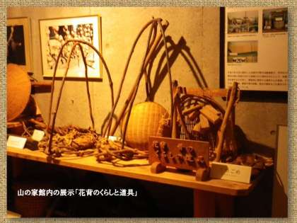 風呂場の前の廊下には,写真や実物の展示がしてあります。これは花背のくらしや文化を伝える展示です。
