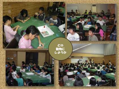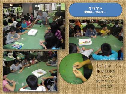 自然の木を適当な大きさに加工した部品を使って,動物キーホルダーを作りました。山の家の所員の方から作り方を指導してもらい,一人一人が一生懸命に作りました。