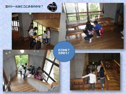 激しい雨が続いています。昼からのプログラムは「館内ウォークラリー」です。「虫」と「鳥」と「野菜・果物」の3つのコースのどれかがあたります。各ポイントで,〈宝にあたる〉文字を拾い集めます。最後に,それらの文字を並べ替えて,一つの文をつくるのです。地図を見ながら,館内を歩き回りました。最後の文づくりもなかなか難しかったようです。
