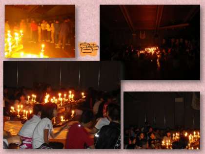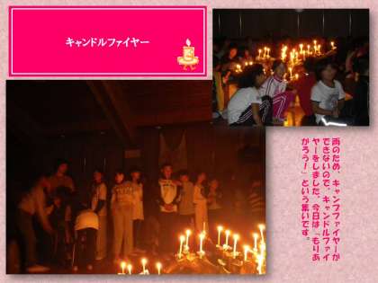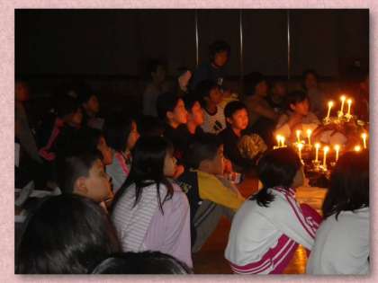 今日のキャンドルファイヤーは,大いに盛り上がる集いです。各学級からの出し物があり,みんなでゲームをしたり,クイズをしたり,思う存分に楽しみました。思い出に残るひとときでしたね。