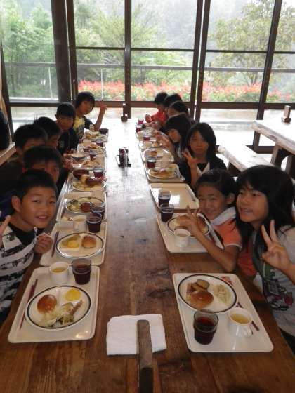 朝食はバイキング形式で…。食欲旺盛な子も多いです。自分に合った分だけを食べるようにしています!おしゃべりが楽しいようですね。