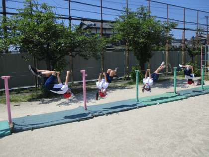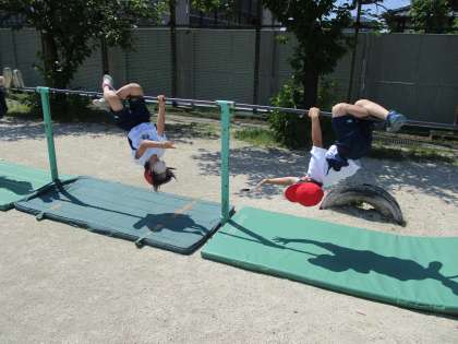 鉄棒に苦手意識がある子もいますが,「鉄棒さんと仲良くなろう!」と言ってできることから取り組んでいます。