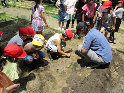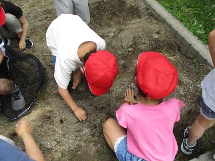 種をよく観察した後,花壇に植えにいきました。