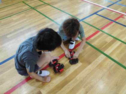 みんな楽しそうに,友だちと協力したり競ったりしながら自動車を走らせていました。