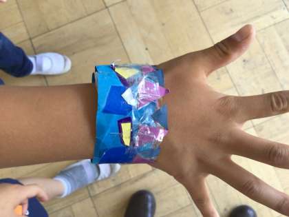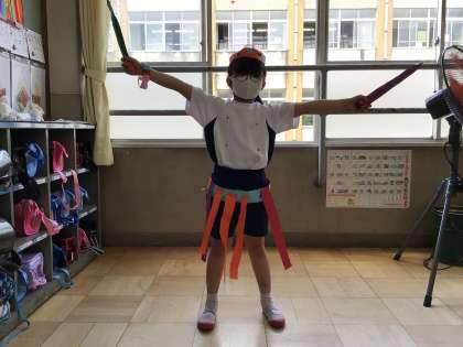 図工の「わっかでへんしん」の 学しゅうをさいど行い,自分の作ひんにさらに工夫を加えて,ポーズもとりました。