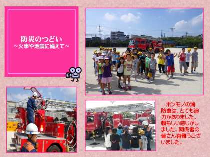 本日,本校の運動場に,はしご車や起震車などが登場し,伏見消防署員,下鳥羽消防分団の皆さん,地域の自主防災会の皆さん,PTAの皆さんのご協力によって「防災のつどい」が実施されました。体験型のコーナーがたくさんあって,子どもたちは,楽しみながら防災への関心を高めていました。とても暑い日でしたが,みんな熱心に体験活動に取り組んでいましたよ。