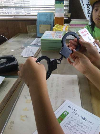 本物の手錠をさわらせていただきました。重かったそうです。