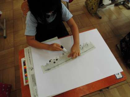 しんぶんしをそっとちぎって,すてきなさくひんをつくっています。