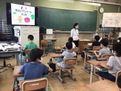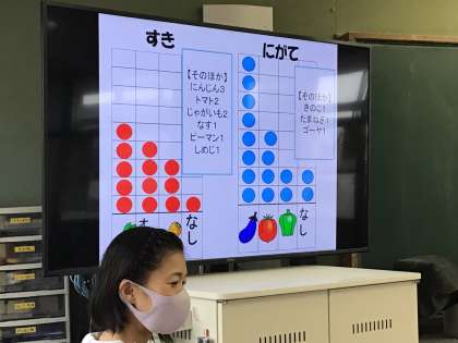 事前にとった「やさいについてのアンケート」をはじめに見て,みんなやさいの すききらいがあるが 苦手でも体のために食べている人がいることを話し合いました。