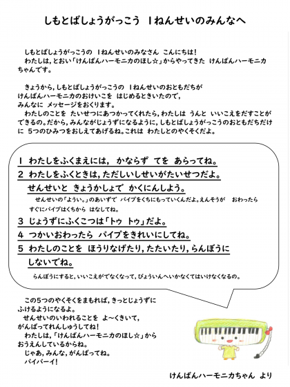なんと,初めて鍵盤ハーモニカの学習をする1年生のために「けんばんハーモニカちゃん」からの手紙も届きました!子どもたちはとても嬉しそうです。残念ながら演奏することはできませんが,準備の仕方や使い方,「ド」や「ソ」の場所を確認しました。
