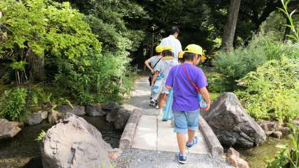 曲水の宴がある庭に入らせてもらいました。つばきやどんぐりなど自然がいっぱいありました。