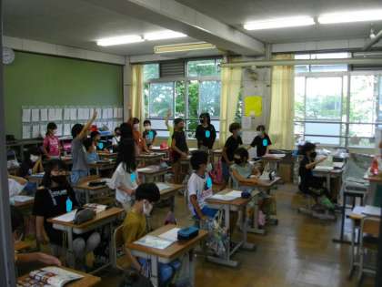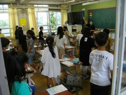 学習の始まりは,先生と子どもたちの「greeting」からスタートします。