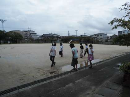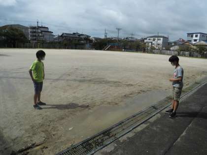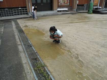 理科の授業では,どうして川が流れているのかという疑問をもち学習がスタートしました。水が流れる原因をさがすために,運動場の様子を観察しました。