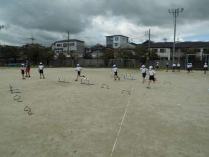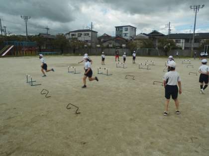 体育の時間に「ハードル走」の学習をしています。今日は,より早く走れるためにはどんな工夫必要なのか考えながらハードル走を行っていました。