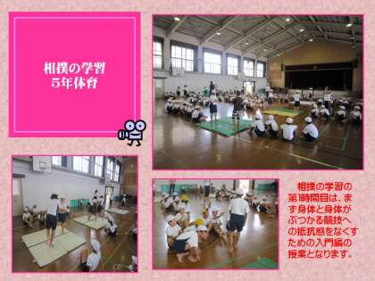 今春,校内に土俵が完成した本校では,体育の時間にも,各学年が「すもうの授業」を実践しています。今日は5年生の体育「すもうの授業」の第1時間目です。多くのお子どもたちは,あまり身体接触のスポーツに慣れているとは言えません。昔は,さまざまな遊びの中で,身体を組んだり,相手にあたったりする遊びがありましたが,最近の子どもたちはあまり好んでそうした遊びをしないようです。