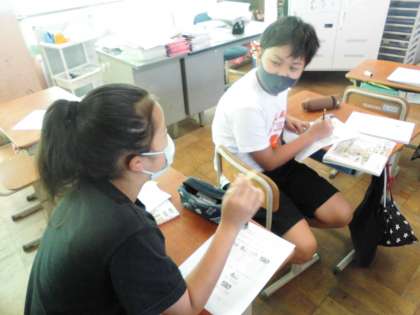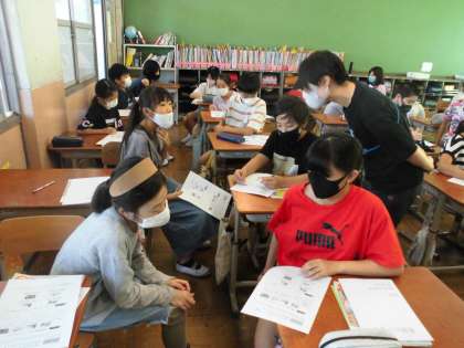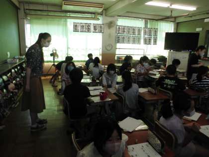 ルーニー先生の英語の発音をしっかりと聞いて,自分たちも同じように発音する練習をマスク越しに小さな声でおこないました。