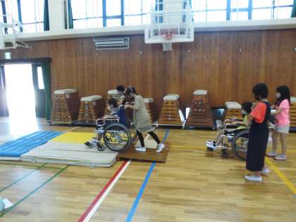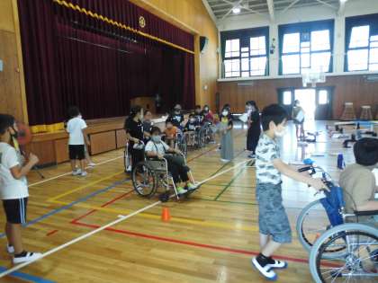 4年生の学習で,車いす体験の様子です。体育館で行っています。