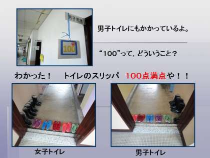 トイレのスリッパの並べ方です。男子も女子もスリッパがきれいに並んでいます。すごく気持ちが良いです。これは,2年生の先生方の工夫のようです。子どもたちが使い終わったスリッパを進んできれいにしています。すごいぞ,2年生。