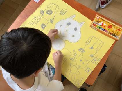 それぞれが思い浮かぶお話の世界を画用紙いっぱいにのびのびと描いています。