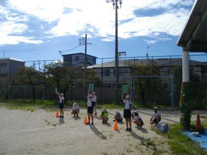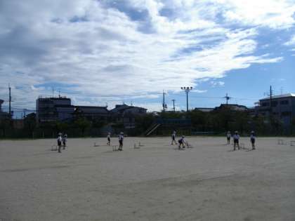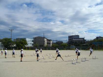 体育交流会に向けて練習しています。走る人がハードル間の長さを色で示して,準備する人がハードルを動かしています。
