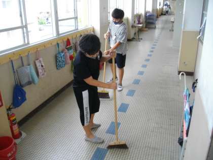 ろうかやくつ箱前をそうじしている5年生です。きれいな学校は気持ちいいですね。