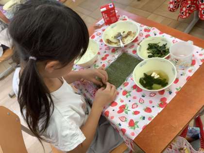 今日の給食は「肉みそなっとう」でした。ご飯と肉みそなっとうを海苔で巻いて食べます。楽しく美味しくいただきました!