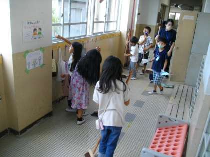 昨日の掃除時間の様子です。うまくほうきを使えるようになったね。