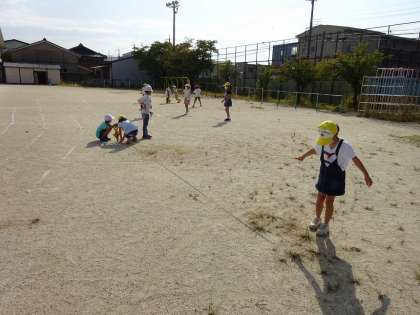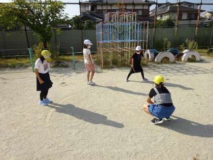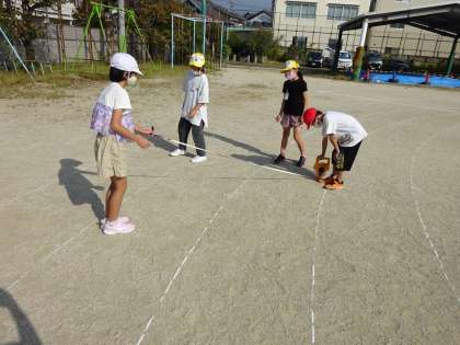 半径2mや半径5mのような大きな円をかく方法を考えました。運動場に行って,巻尺を使って大きな円をかくことに挑戦しています。